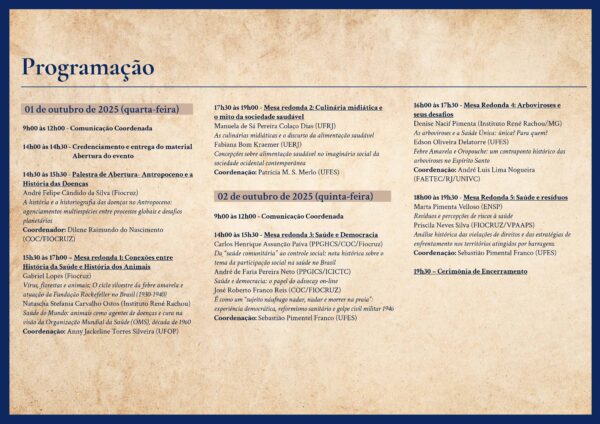 A programação de dois dias contará com uma conferência de abertura, cinco mesas-redondas, duas sessões de comunicações coordenadas com trabalhos de diversas universidades do país, um minicurso, duas oficinas e uma conferência de encerramento. Terá formato híbrido, pois também será transmitida no Youtube. Nas demais mesas redondas, serão tratados temas como Antropoceno e a História das Doenças; conexões entre História da Saúde e História dos Animais; culinária midiática e o mito da sociedade saudável; arboviroses e seus desafios; e saúde e resíduos.
